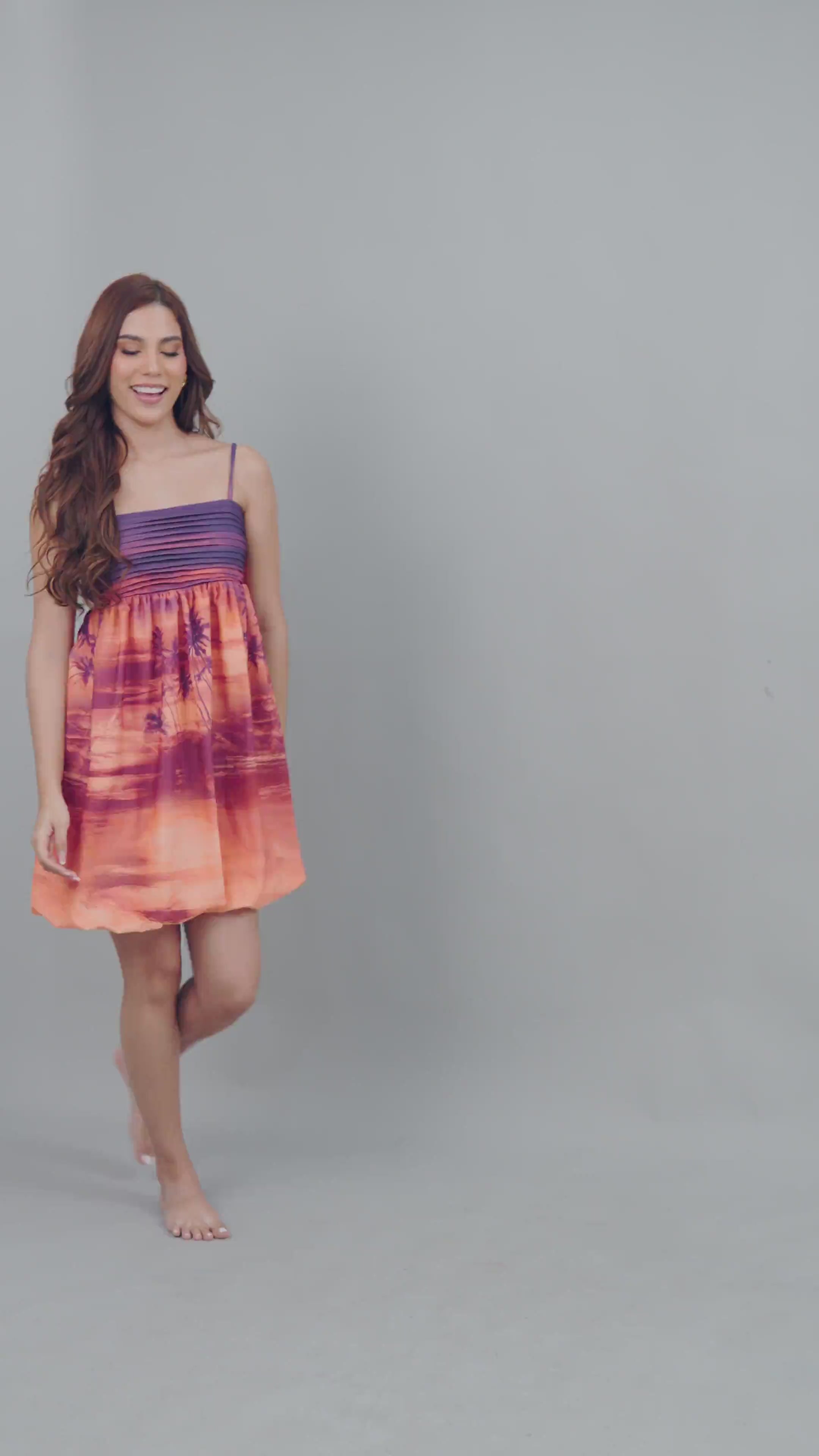 Prenda elaborada en tela georgette de tacto suave, ligera y con caída fluida, con alforza en busto y lazo trasero, sometida a un proceso de sublimación digital con print exclusivo de la marca.